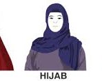 Le « hijab », porté par de nombreuses femmes musulmanes, est un simple foulard cachant les cheveux, les oreilles et le cou. Hijab signifie « voile », un autre nom utilisé pour parler de ce foulard. Le « tchador », posé sur la tête, couvre le corps mais laisse le visage apparent. Il est porté par les musulmanes iraniennes. Le « niqab » couvre tout le corps et laisse seulement une fente pour les yeux. La « burqa », vêtement traditionnel afghan, recouvre lui aussi la tête et le corps et ne permet qu’un grillage dissimulant les yeux.